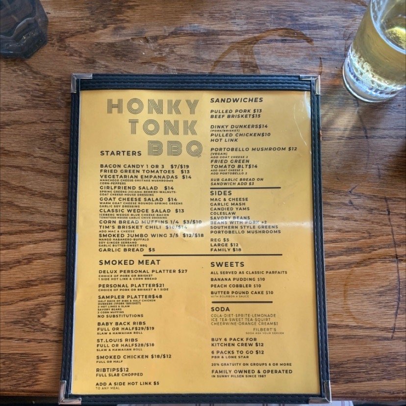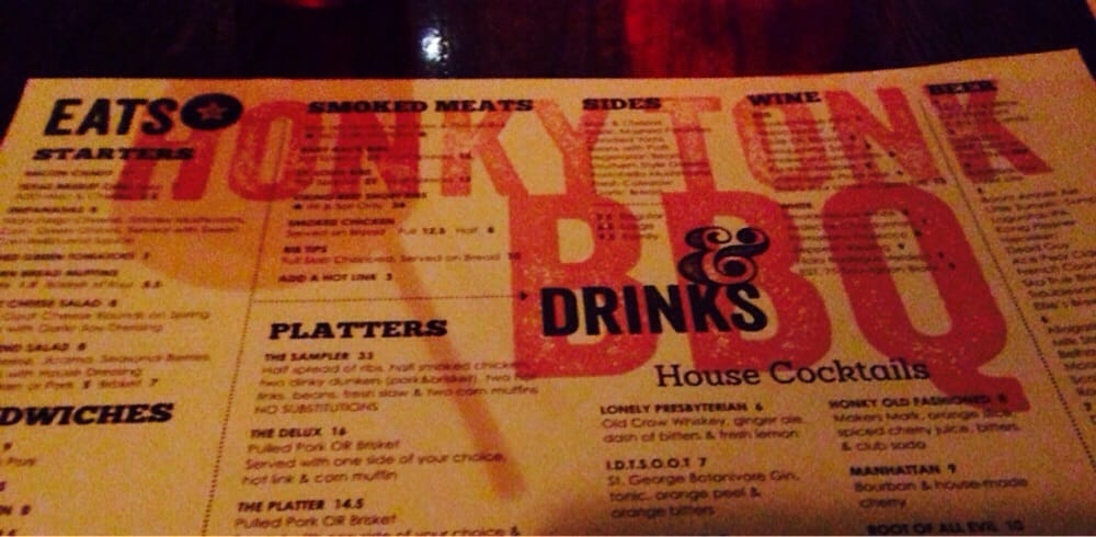Introducing the menu at Honky Tonk BBQ, a lively and casual dining spot located in Chicago. Offering a wide range of options, from the indulgent Bacon Candy to the flavorful Vegetarian Empanadas, every dish is bursting with unique flavors. The platters, like the Sampler Platter and the DELUX Personal Platter, showcase a variety of meats and sides that will satisfy any BBQ craving. Customers rave about the tender brisket and the tasty sauces. The ambiance is welcoming with live music on select nights, adding to the overall dining experience. Don't miss out on the moist cornbread muffins and the fun food items like the bacon strips. With friendly service and great food, Honky Tonk BBQ is a must-visit for all BBQ enthusiasts.